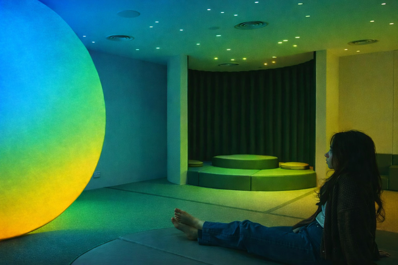 Light Formation: The narrow overhead bubble expands into a wide, soft glow that gently envelops the passenger’s entire body.
